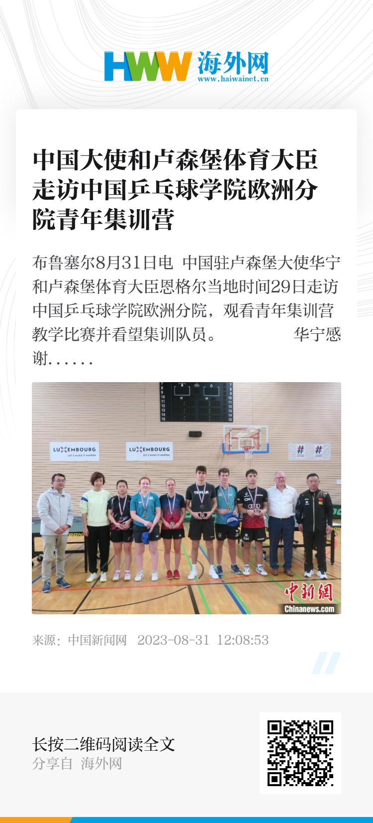 中新网布鲁塞尔8月31日电 中国驻卢森堡大使华宁和卢森堡体育大臣恩格尔当地时间29日走访中国乒乓球学院欧洲分院,观看青年集训营教学比赛并看望集训队员。