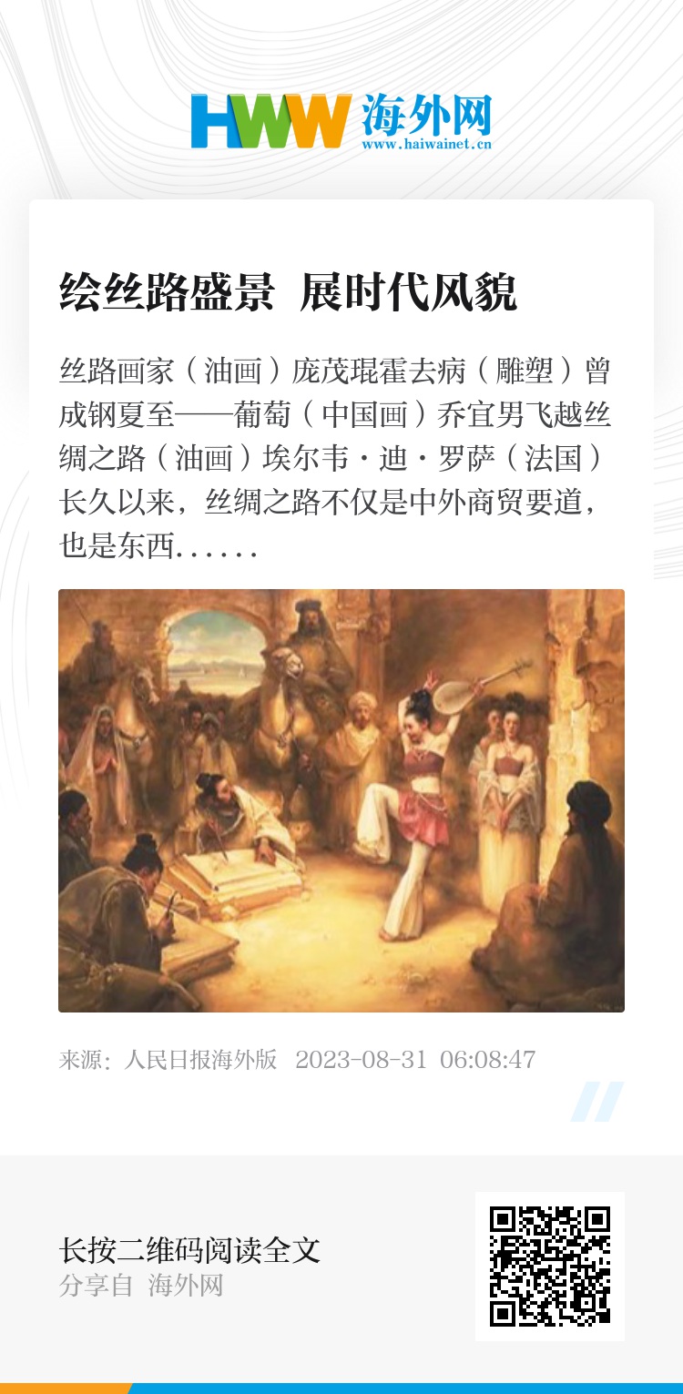 今年是共建“一带一路”倡议提出十周年。值此之际,由中国国家画院主办的“中国国家画院‘一带一路’主题美术作品展(首展)”日前在京举办。展览以近200件美术作品讲述丝路故事,阐释以“和平合作、开放包容、互学互鉴、互利共赢”为核心的丝路精神。