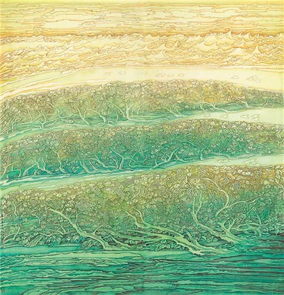 艺术家乔宜男的画作《丝路夕照》,呈现了夕阳西下,雅丹地貌浑厚苍茫的景象。为了创作这幅作品,他先后两次前往新疆采风,在火焰山等地寻找灵感。从日出到日落,他常常对着一片雅丹地貌整日写生,只为寻找最美的那一刻。乔宜男说,雅丹地貌原本是荒野上的一种地形,在古代丝绸之路开辟之前,人们并不曾涉足,“在这样的地形上踏出一条连接东西方文明的道路,最能体现开拓精神。这也是我想要传达的内涵。”