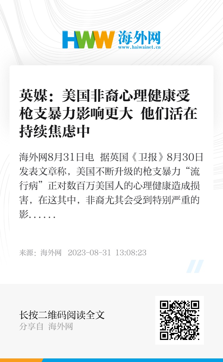 海外网8月31日电 据英国《卫报》8月30日发表文章称,美国不断升级的枪支暴力“流行病”正对数百万美国人的心理健康造成损害,在这其中,非裔尤其会受到特别严重的影响。