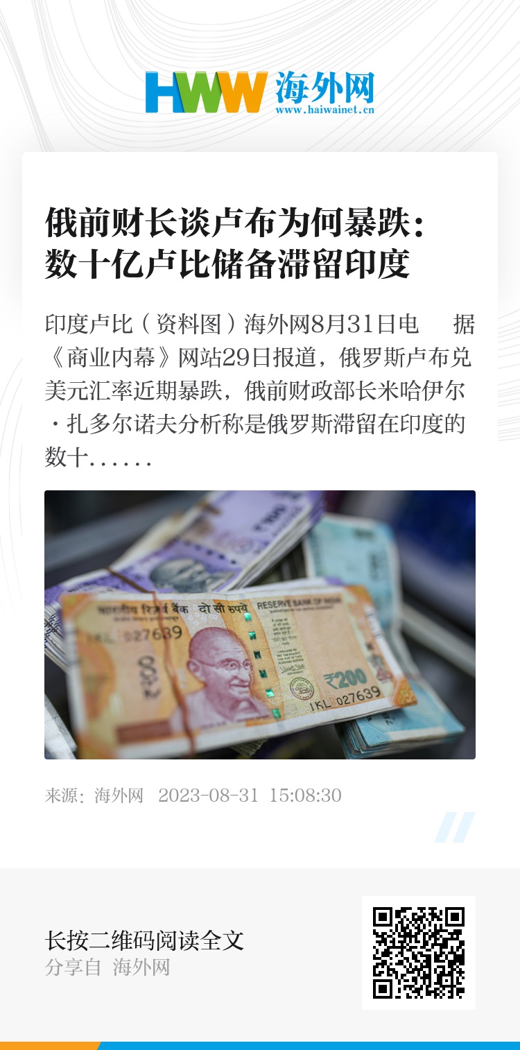 海外网8月31日电 据《商业内幕》网站29日报道,俄罗斯卢布兑美元汇率近期暴跌,俄前财政部长米哈伊尔·扎多尔诺夫分析称是俄罗斯滞留在印度的数十亿卢比储备所致。