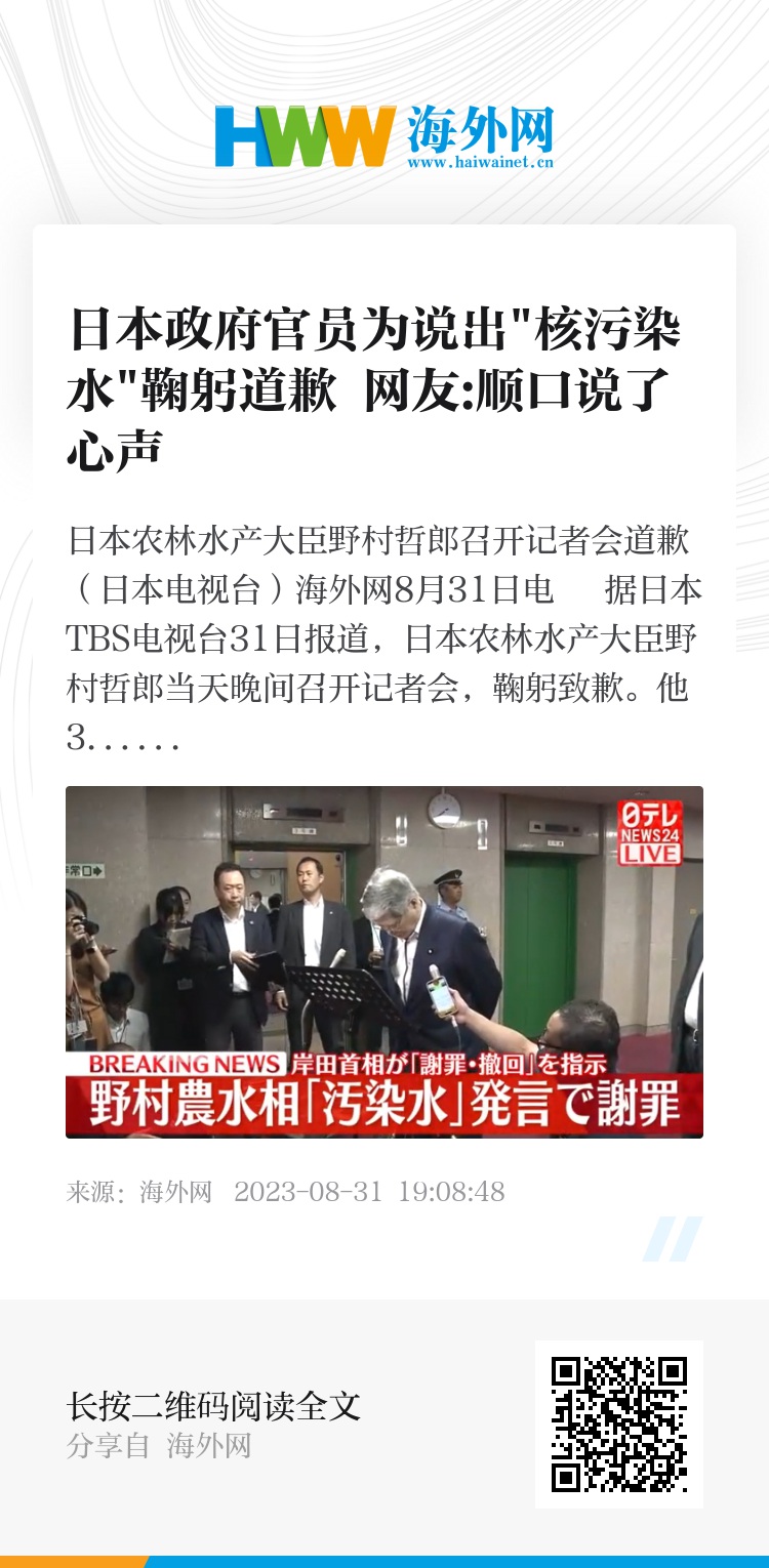 海外网8月31日电 据日本TBS电视台31日报道,日本农林水产大臣野村哲郎当天晚间召开记者会,鞠躬致歉。他31日下午接受采访时,顺口说出了“核污染水”一词,而日本政府将其称作“处理水”。