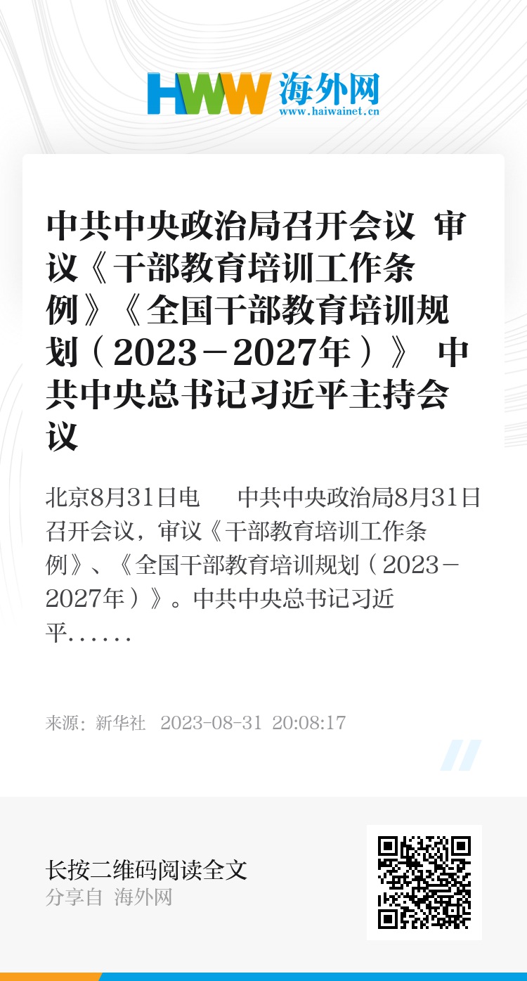 新华社北京8月31日电 中共中央政治局8月31日召开会议,审议《干部教育培训工作条例》、《全国干部教育培训规划(2023-2027年)》。中共中央总书记习近平主持会议。