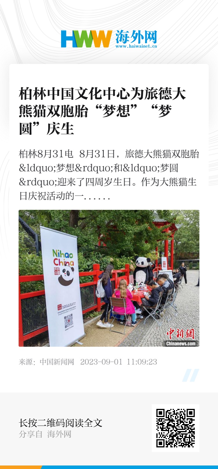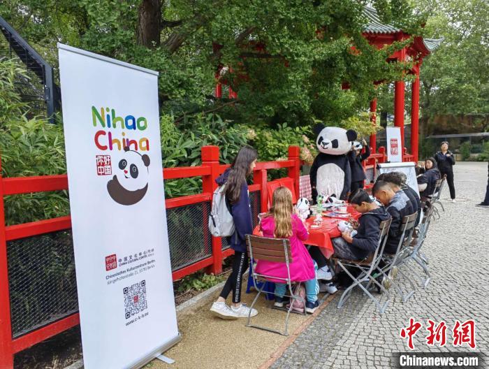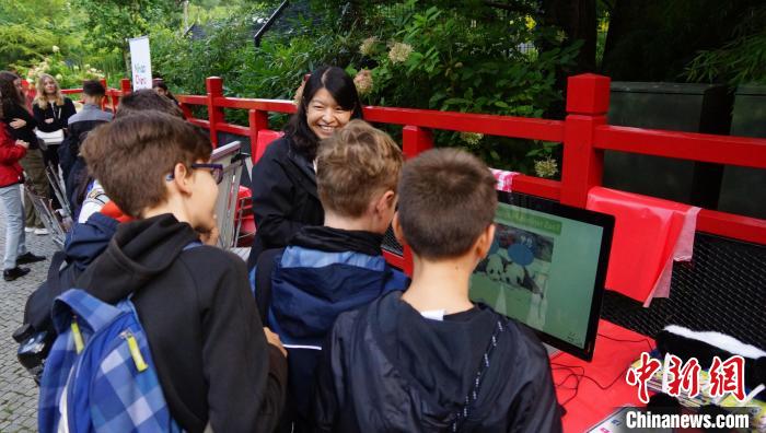 中新网柏林8月31电 8月31日,旅德大熊猫双胞胎“梦想”和“梦圆”迎来了四周岁生日。作为大熊猫生日庆祝活动的一部分,柏林中国文化中心在熊猫馆旁设立了展位,向游客们推广大熊猫主题文化。