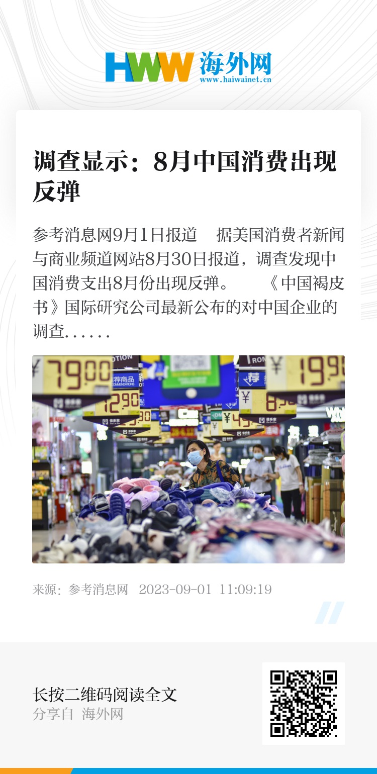 参考消息网9月1日报道 据美国消费者新闻与商业频道网站8月30日报道,调查发现中国消费支出8月份出现反弹。