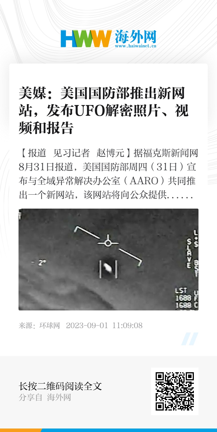 【环球网报道 见习记者 赵博元】据福克斯新闻网8月31日报道,美国国防部周四(31日)宣布与全域异常解决办公室(AARO)共同推出一个新网站,该网站将向公众提供有关UFO的解密信息,即政府所称的“未确认异常现象”(UAP)。