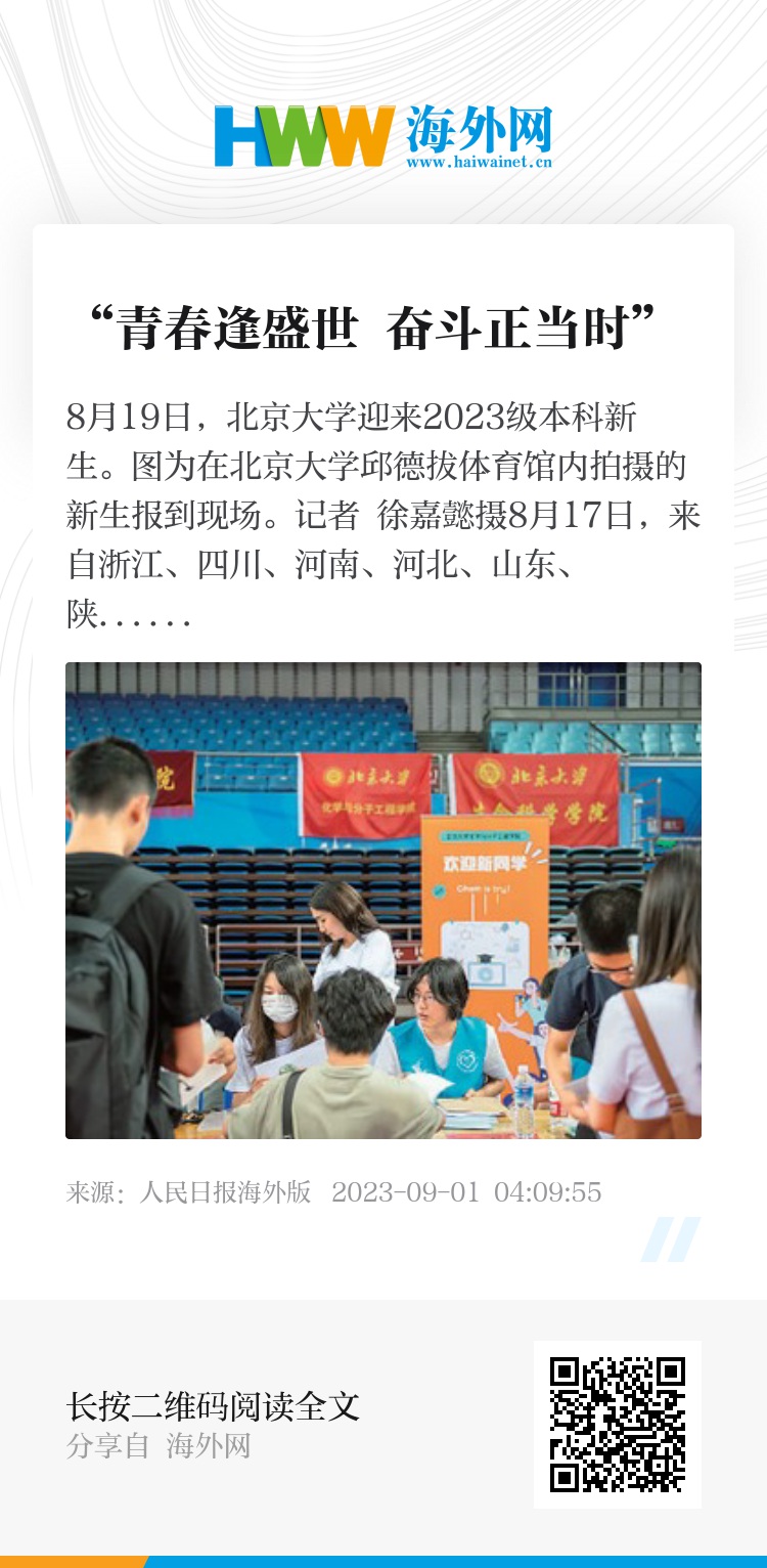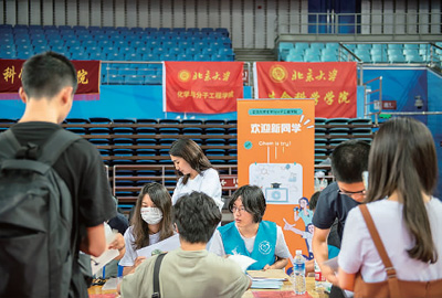 8月19日,北京大学迎来2023级本科新生。图为在北京大学邱德拔体育馆内拍摄的新生报到现场。新华社记者 徐嘉懿摄