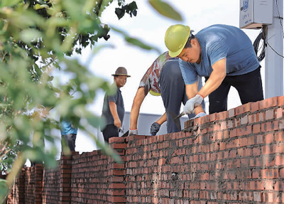 眼下,河北省邢台市宁晋县灾后恢复重建工作正紧张进行,受灾学校围墙修复、室内外地面恢复等项目全部入场施工,全力开展工作,限期推进,确保正常开学。图为8月24日,施工人员在河渠镇李家营中心小学修建学校外墙。新华社记者 骆学峰摄