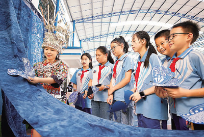 8月17日,来自浙江、四川、河南、河北、山东、陕西、江西、云南、贵州九省的20名美术老师,来到贵州省黔东南苗族侗族自治州丹寨县城关第一小学,为小学生上开学前的特色美育课。图为老师在教学生用苗族蜡染图案做装饰。黄晓海摄(人民图片)