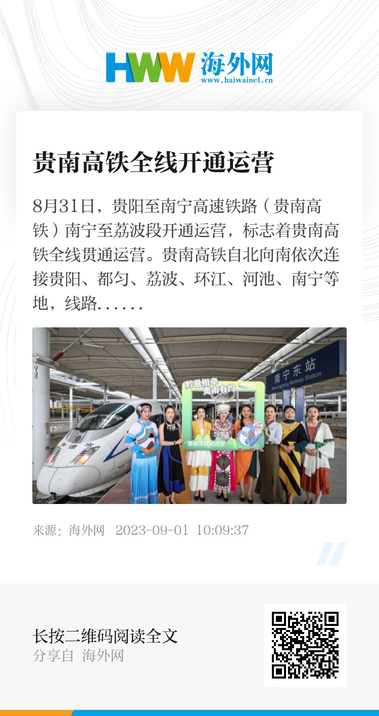 8月31日,贵阳至南宁高速铁路(贵南高铁)南宁至荔波段开通运营,标志着贵南高铁全线贯通运营。贵南高铁自北向南依次连接贵阳、都匀、荔波、环江、河池、南宁等地,线路全长482公里,设计时速350公里。全线开通运营初期,国铁集团将按照日常线、周末线、高峰线安排列车开行,南宁至贵阳、成都、重庆等多地将开行直达列车。图片来源:视觉中国