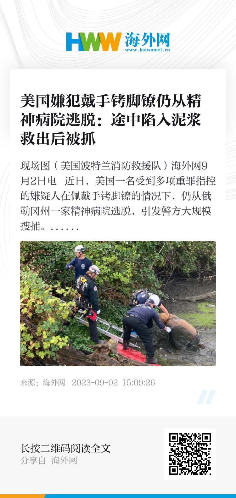 海外网9月2日电 近日,美国一名受到多项重罪指控的嫌疑人在佩戴手铐脚镣的情况下,仍从俄勒冈州一家精神病院逃脱,引发警方大规模搜捕。据美国有线电视新闻网(CNN)9月1日报道,俄勒冈州警方当天宣布,这名嫌犯在一处满是泥浆的池塘被发现,在被救出不久后被重新逮捕。