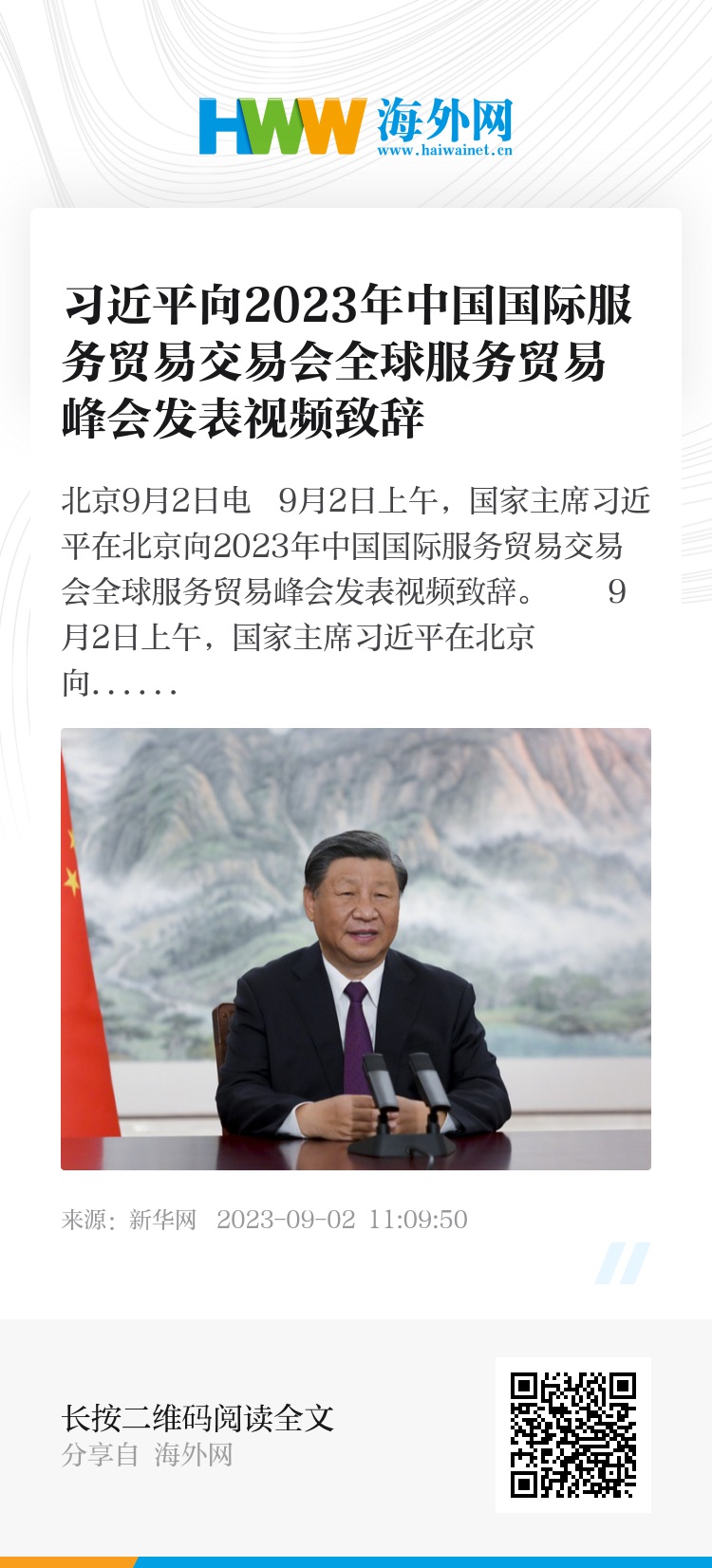 新华社北京9月2日电 9月2日上午,国家主席习近平在北京向2023年中国国际服务贸易交易会全球服务贸易峰会发表视频致辞。