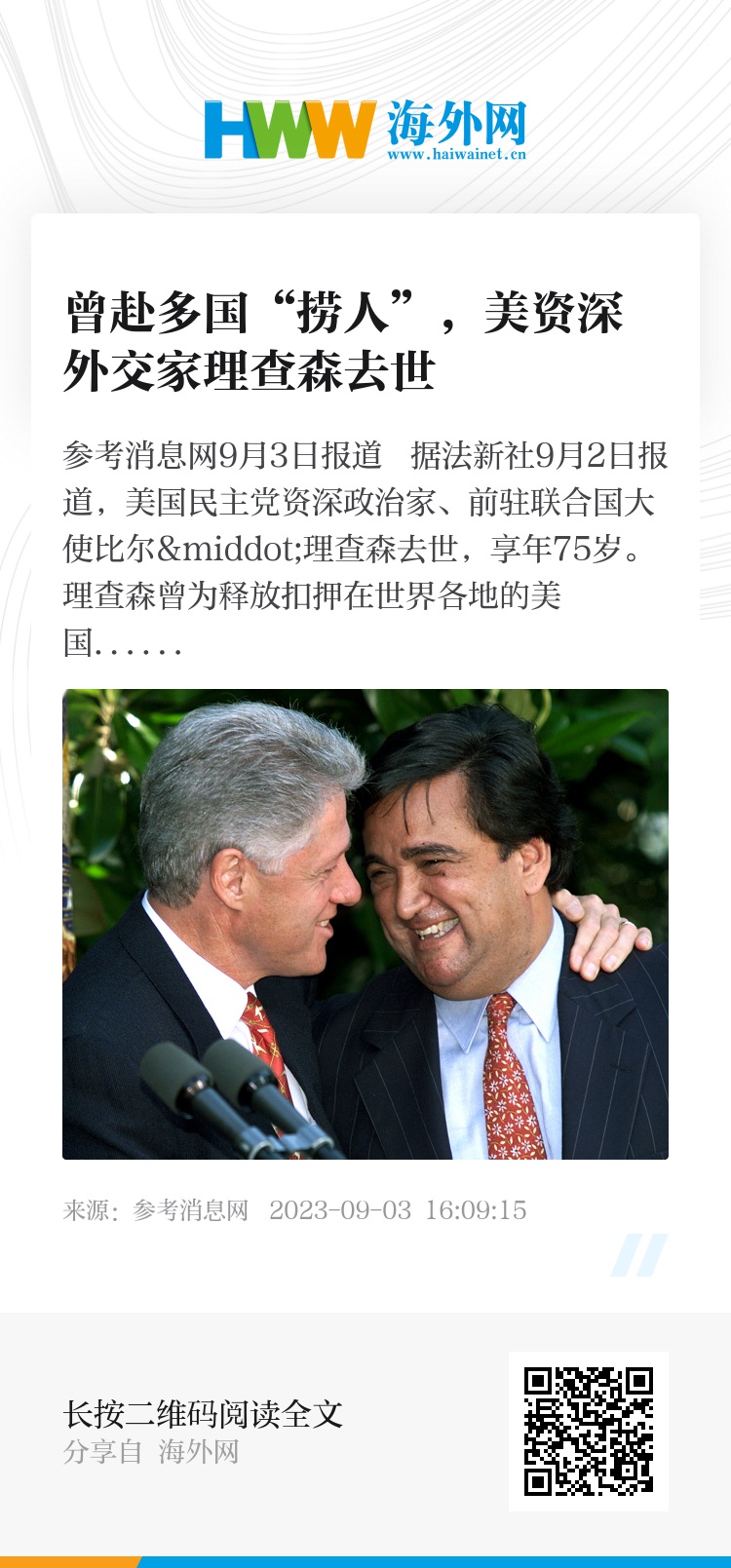 参考消息网9月3日报道 据法新社9月2日报道,美国民主党资深政治家、前驻联合国大使比尔·理查森去世,享年75岁。理查森曾为释放扣押在世界各地的美国人而从事数十年的谈判工作。