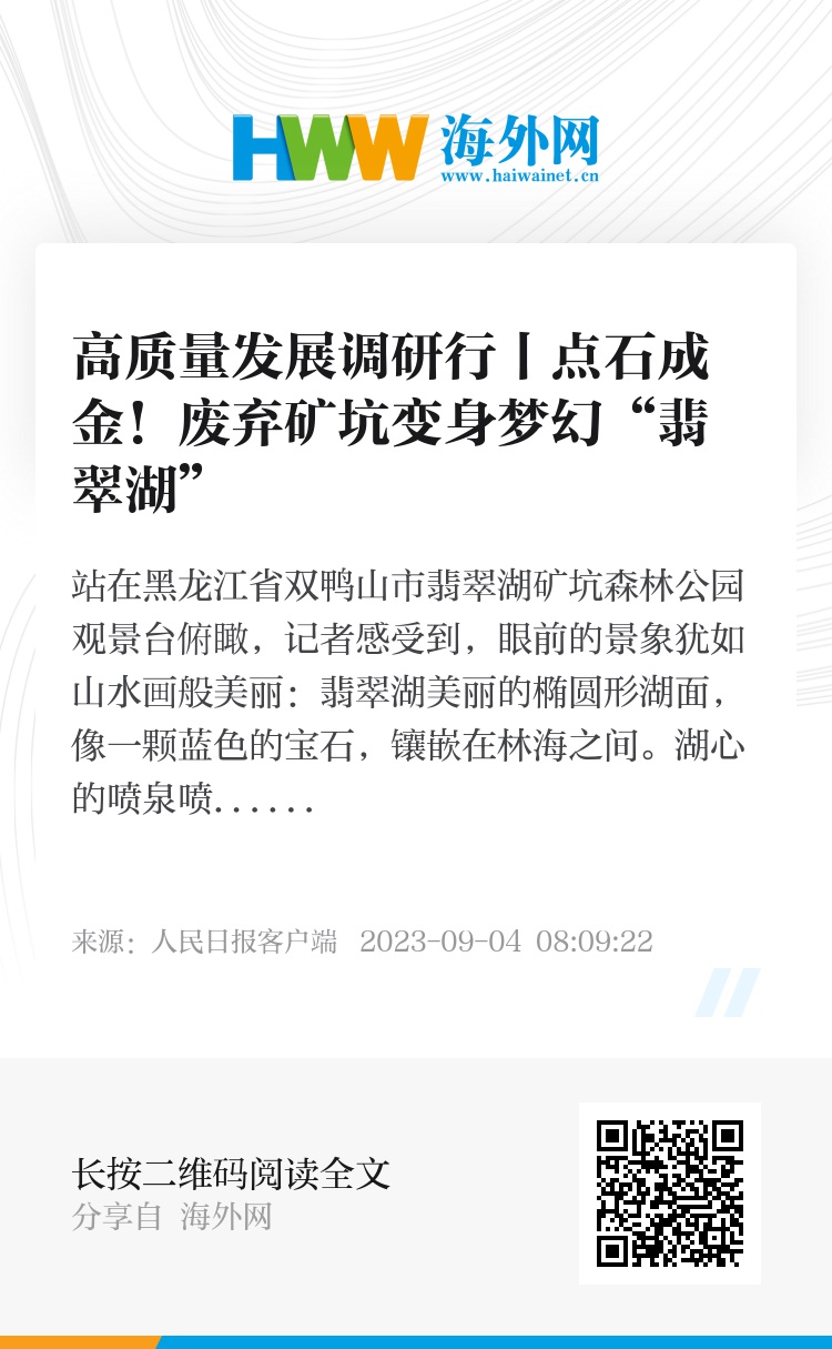 站在黑龙江省双鸭山市翡翠湖矿坑森林公园观景台俯瞰,记者感受到,眼前的景象犹如山水画般美丽:翡翠湖美丽的椭圆形湖面,像一颗蓝色的宝石,镶嵌在林海之间。湖心的喷泉喷出的水花在阳光照射下如同一颗颗闪光的钻石,落在水面时给平静的湖水掀起阵阵涟漪。