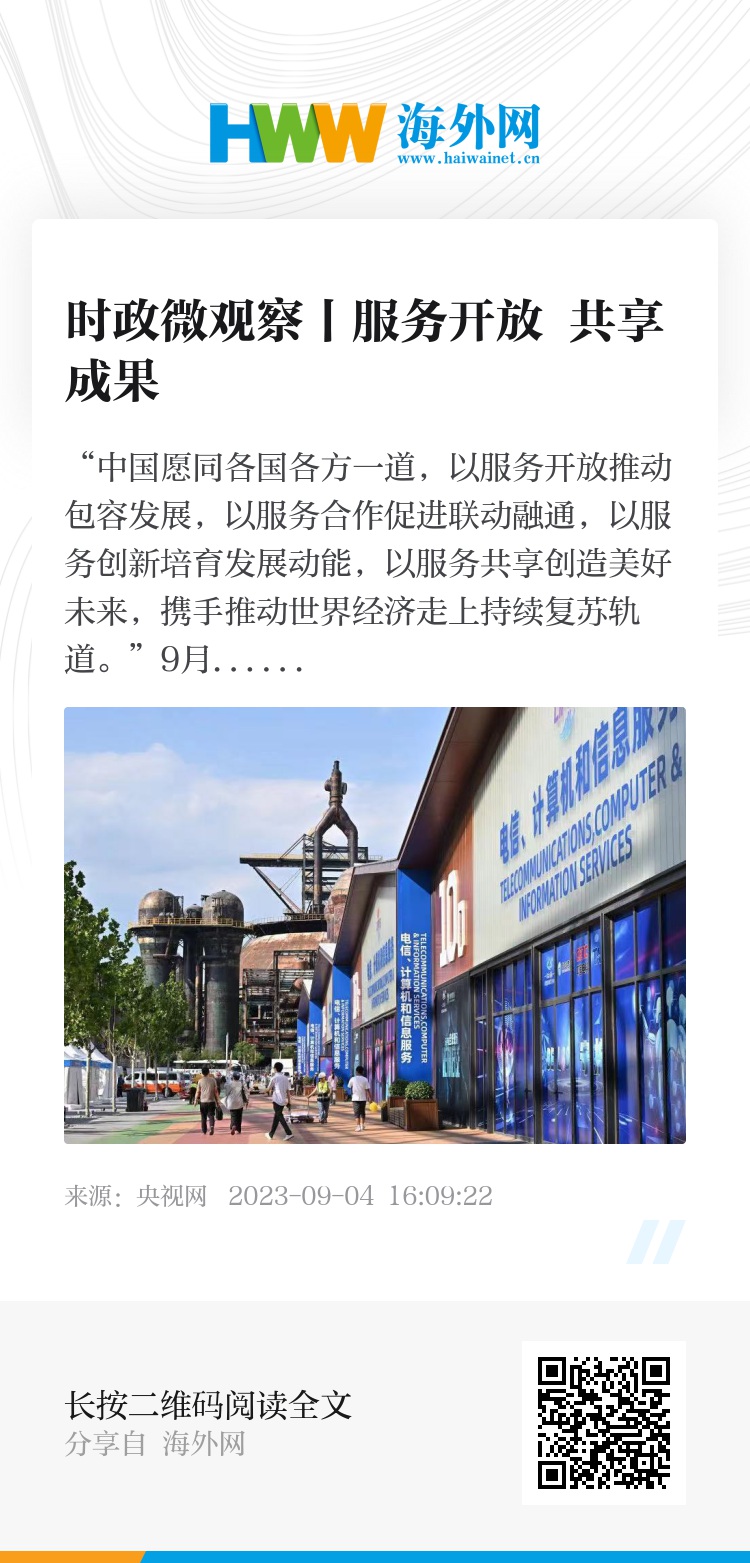9月2日,习近平主席在北京向2023年中国国际服务贸易交易会全球服务贸易峰会发表视频致辞,向世界宣示中国促进服务经济开放共享、推动世界经济复苏发展的担当和主张。
