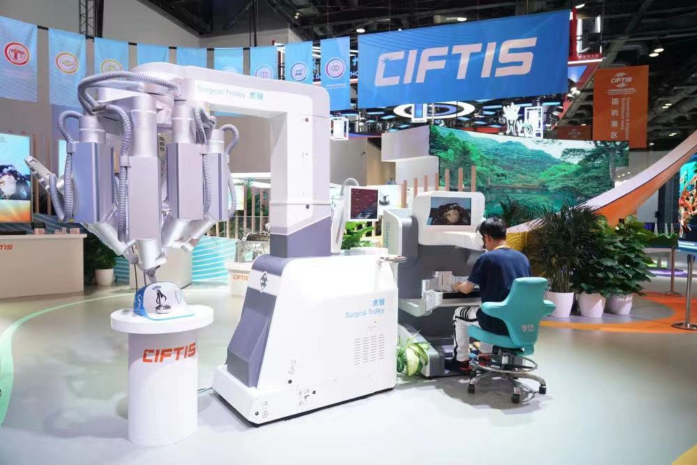 △2023年服贸会国家会议中心综合展区展出的单孔腔镜手术机器人