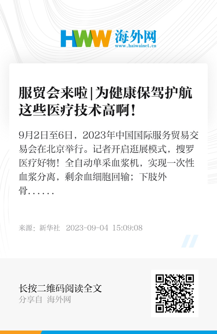 9月2日至6日,2023年中国国际服务贸易交易会在北京举行。新华网记者开启逛展模式,搜罗医疗好物!全自动单采血浆机,实现一次性血浆分离,剩余血细胞回输;下肢外骨骼步行康复器,提供高质量步行训练;关节置换机器人,辅助骨科医生快速精准规划手术路径。
