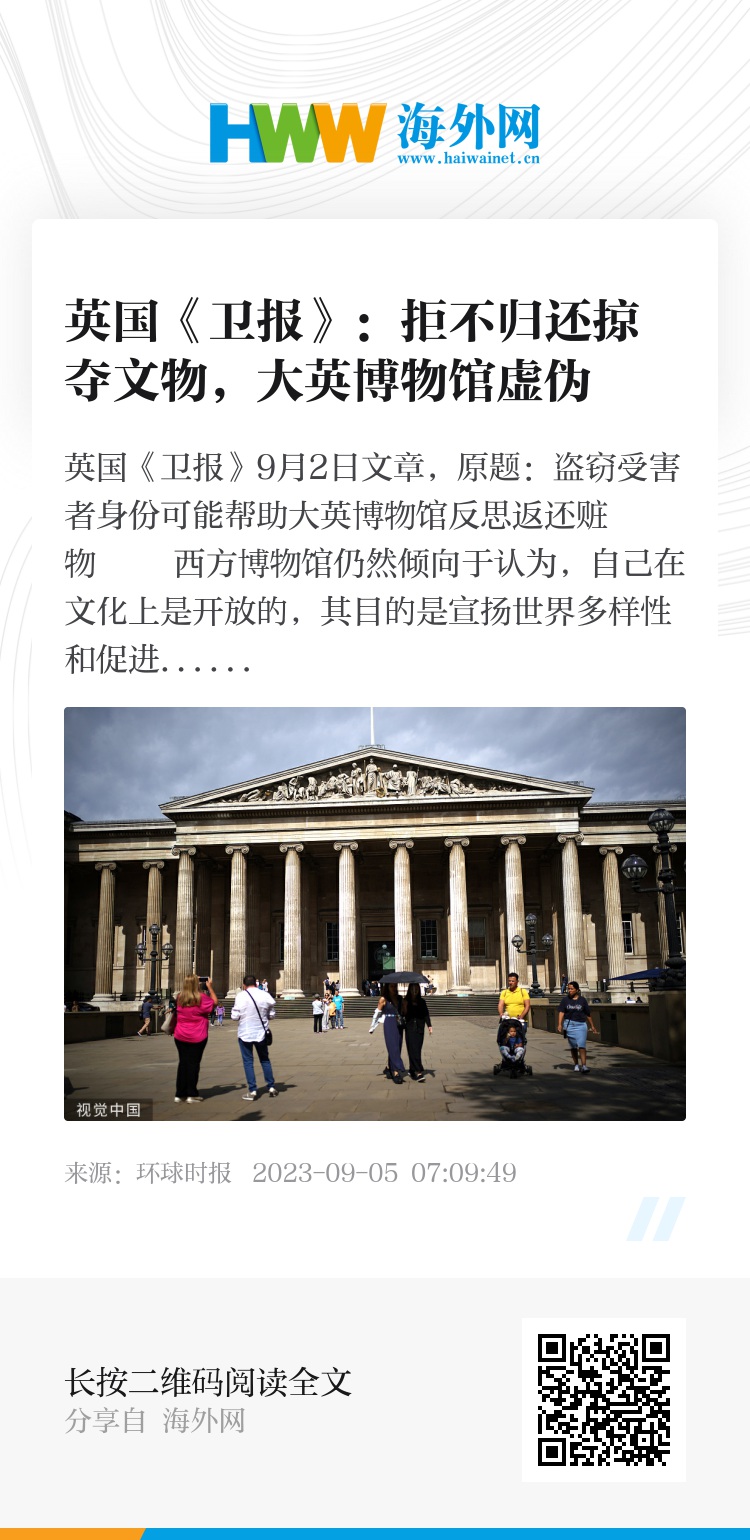 英国《卫报》9月2日文章,原题:盗窃受害者身份可能帮助大英博物馆反思返还赃物 西方博物馆仍然倾向于认为,自己在文化上是开放的,其目的是宣扬世界多样性和促进国际社会对世界文明的了解。但近年来,进步人士开始反对这种观点,认为其展出的一些文物,尤其是被掠夺的文物,应该归还原籍国。