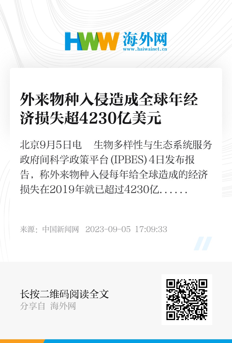 中新网北京9月5日电 生物多样性与生态系统服务政府间科学政策平台(IPBES)4日发布报告,称外来物种入侵每年给全球造成的经济损失在2019年就已超过4230亿美元,且该损失自1970年来每十年至少翻两番。
