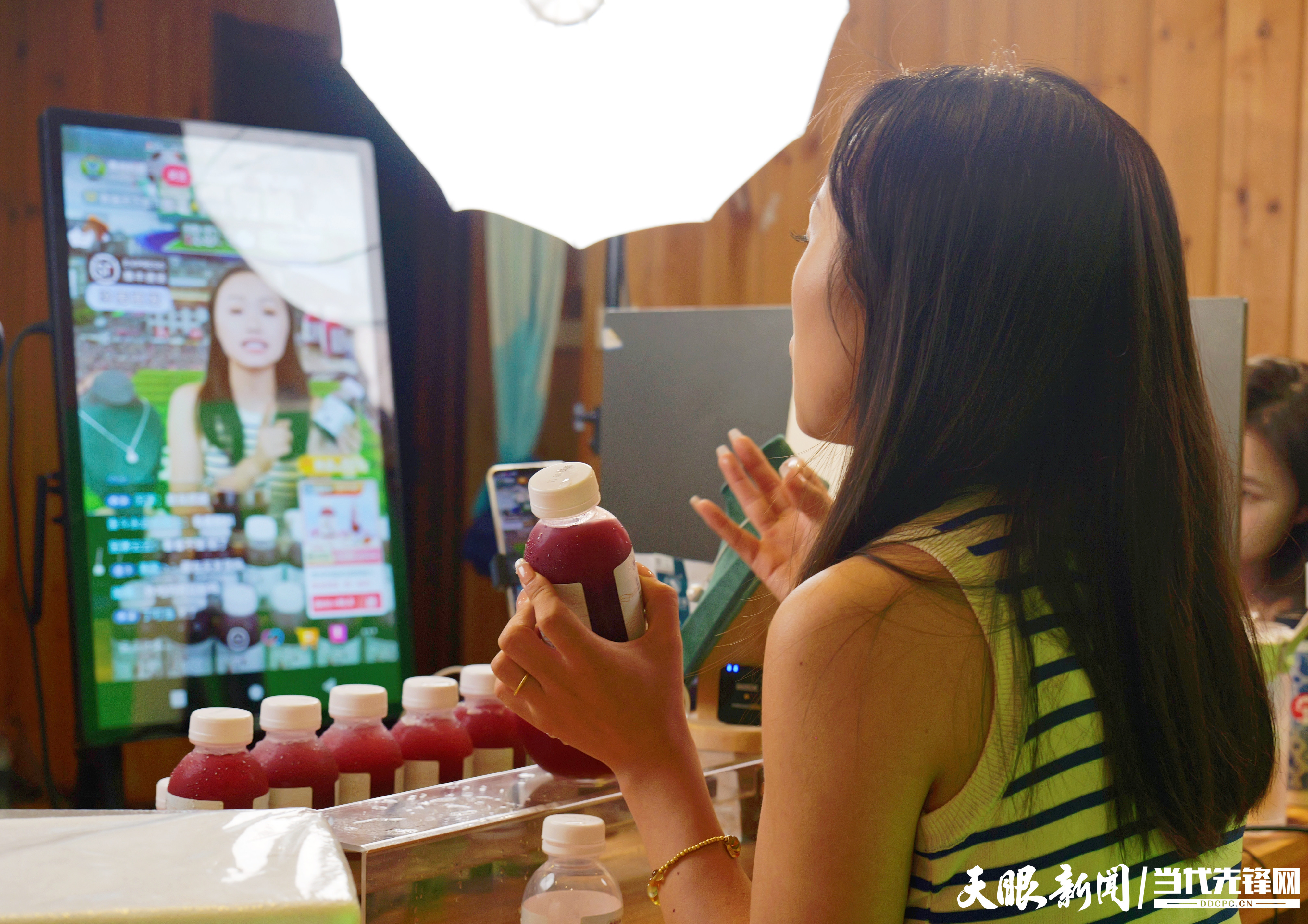 在榕江新媒体产业园,村民在直播销售杨梅汁饮料。