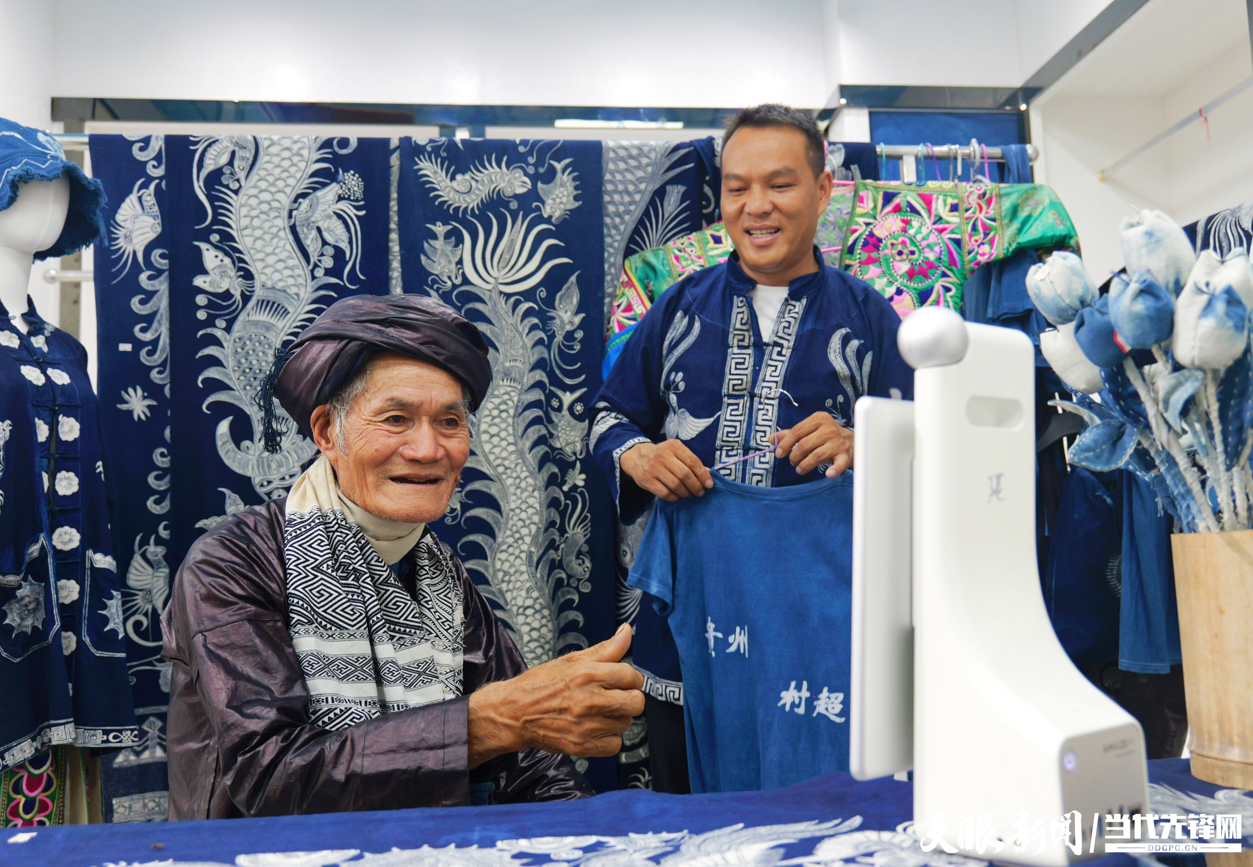 在榕江县摆贝苗寨,村民在直播销售蜡染工艺品。