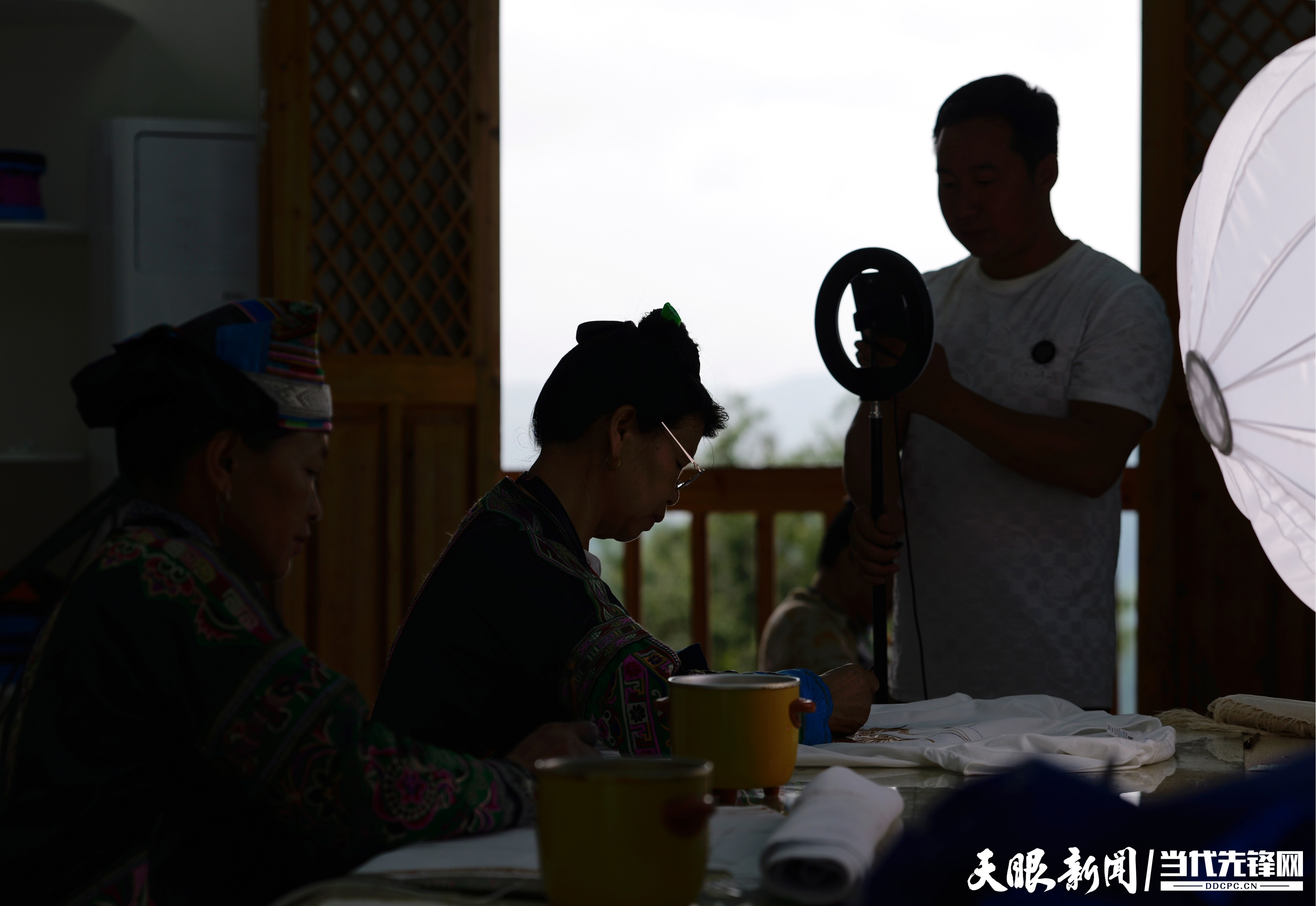 月亮山中最古老的苗寨里,百鸟衣要经过纺织、染布、捶布、刺绣、镶吊羽绒等复杂手工艺,才能完成。8月25日11时,在兴华乡摆贝苗寨的蜡染工坊,几名绣娘正赶制服饰,染过的布匹在广场上滴滴答答沥着水,做好的衣裳被送往一墙之隔的直播间。