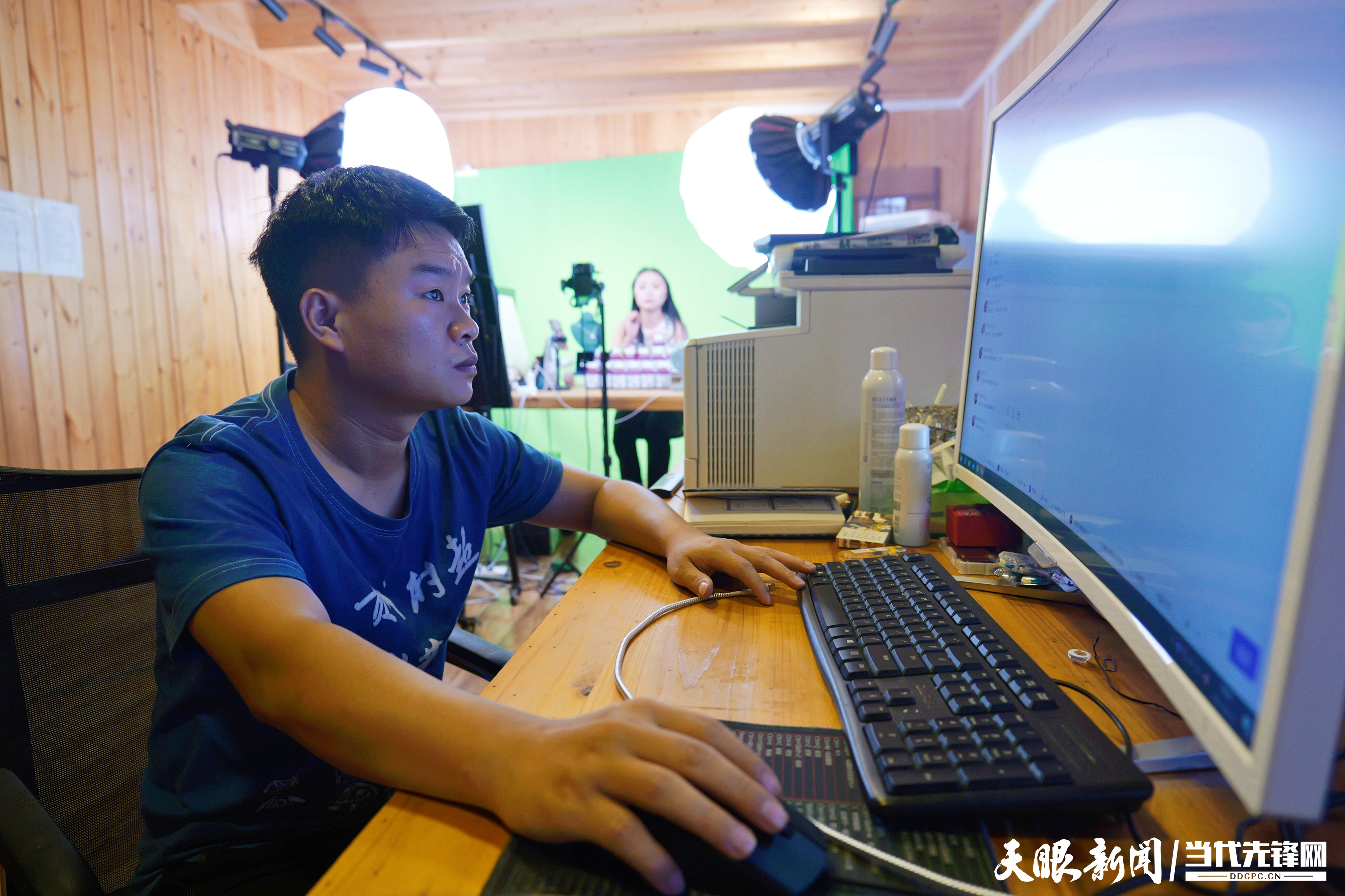 在榕江新媒体产业园,贵州山呷呷农产品有限公司总经理唐胜忠在查看直播数据。