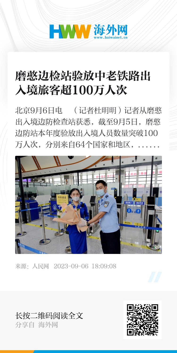 人民网北京9月6日电 (记者杜明明)记者从磨憨出入境边防检查站获悉,截至9月5日,磨憨边防站本年度验放出入境人员数量突破100万人次,分别来自64个国家和地区,达1000541人次,验放出入境车辆达236914辆次,口岸发展活力愈加明显。