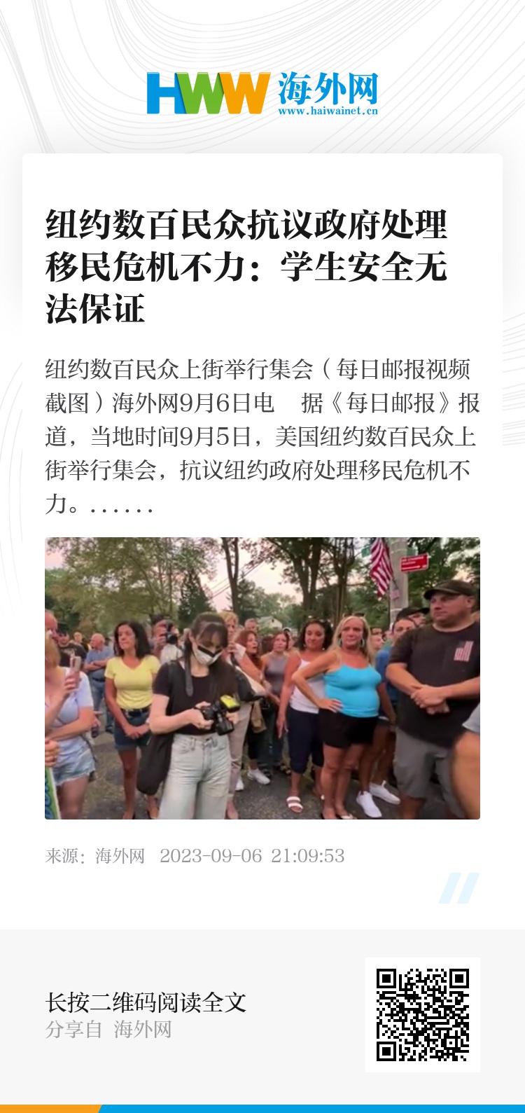 海外网9月6日电 据《每日邮报》报道,当地时间9月5日,美国纽约数百民众上街举行集会,抗议纽约政府处理移民危机不力。