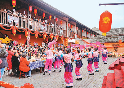 龙南市关西镇新围村的客家围屋里,村民们观看文化惠民大舞台赣南采茶戏展演。朱海鹏摄(人民视觉)
