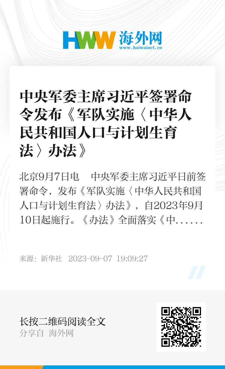 新华社北京9月7日电 中央军委主席习近平日前签署命令,发布《军队实施〈中华人民共和国人口与计划生育法〉办法》,自2023年9月10日起施行。