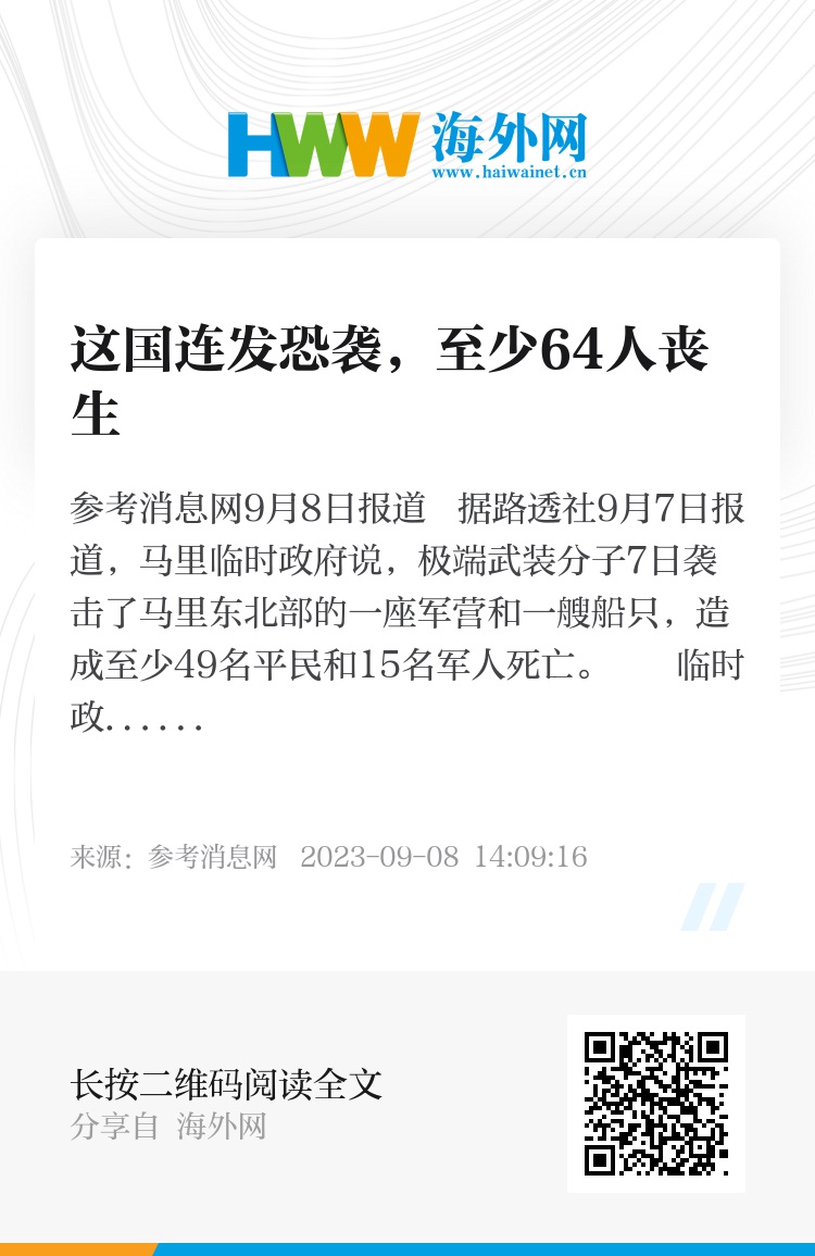 参考消息网9月8日报道 据路透社9月7日报道,马里临时政府说,极端武装分子7日袭击了马里东北部的一座军营和一艘船只,造成至少49名平民和15名军人死亡。