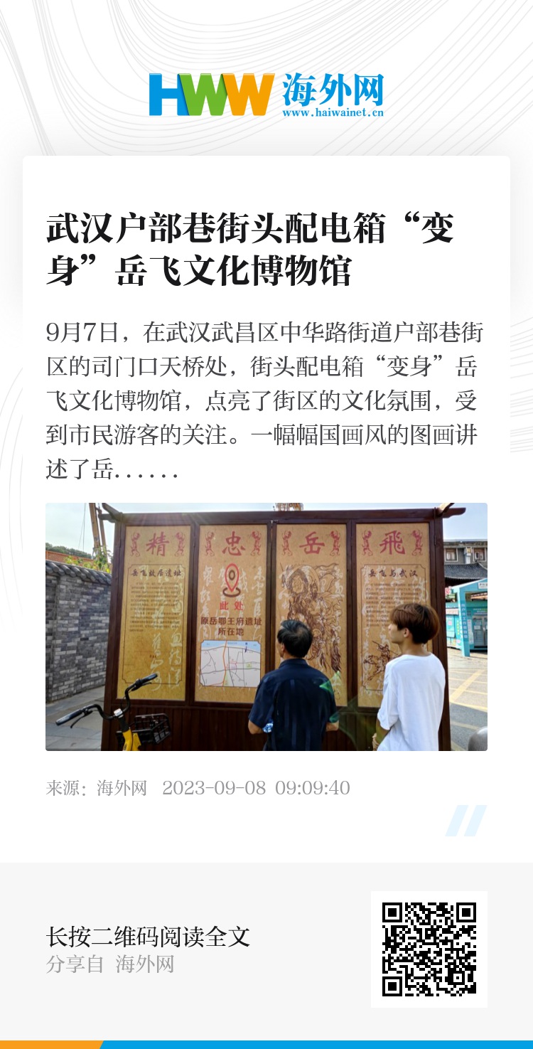 9月7日,在武汉武昌区中华路街道户部巷街区的司门口天桥处,街头配电箱“变身”岳飞文化博物馆,点亮了街区的文化氛围,受到市民游客的关注。一幅幅国画风的图画讲述了岳飞本人及岳飞与武汉的故事,让配电设施瞬间成了弘扬岳飞精神的街头博物馆,为街区增添了不少文化气息。同时,为方便工人对配电箱进行维护,在箱体设计上采用的是双开门式设计,工人只需要把门栓提起来就可以进入维修,实现了配电箱维护与文化宣传双赢。图片作者:视觉中国