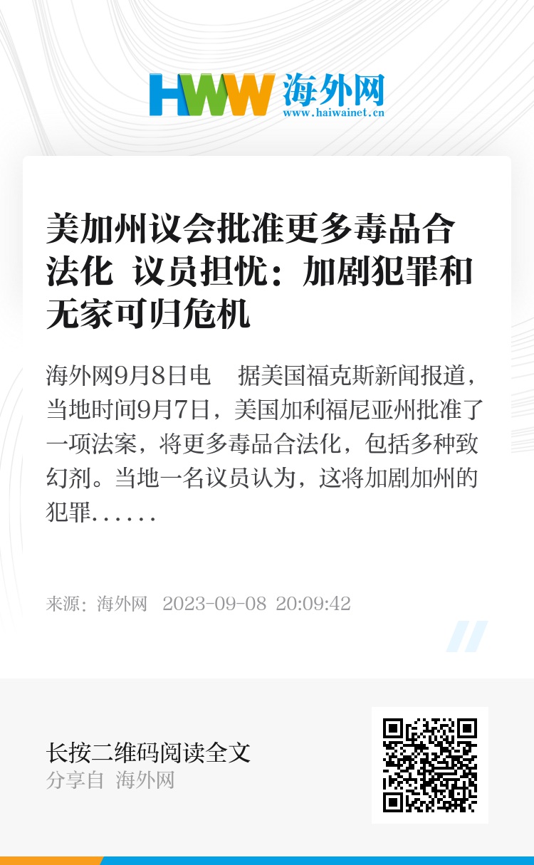 海外网9月8日电 据美国福克斯新闻报道,当地时间9月7日,美国加利福尼亚州批准了一项法案,将更多毒品合法化,包括多种致幻剂。当地一名议员认为,这将加剧加州的犯罪和无家可归危机。
