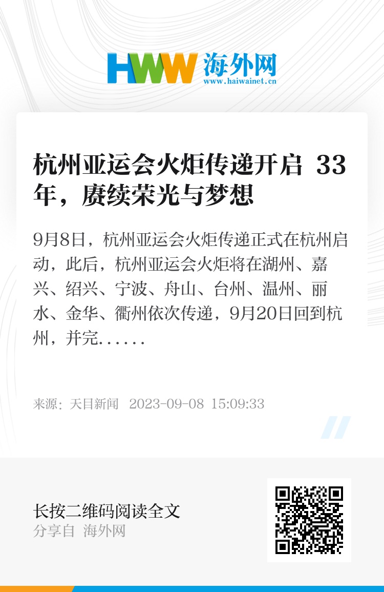 9月8日,杭州亚运会火炬传递正式在杭州启动,此后,杭州亚运会火炬将在湖州、嘉兴、绍兴、宁波、舟山、台州、温州、丽水、金华、衢州依次传递,9月20日回到杭州,并完成最后一站传递。