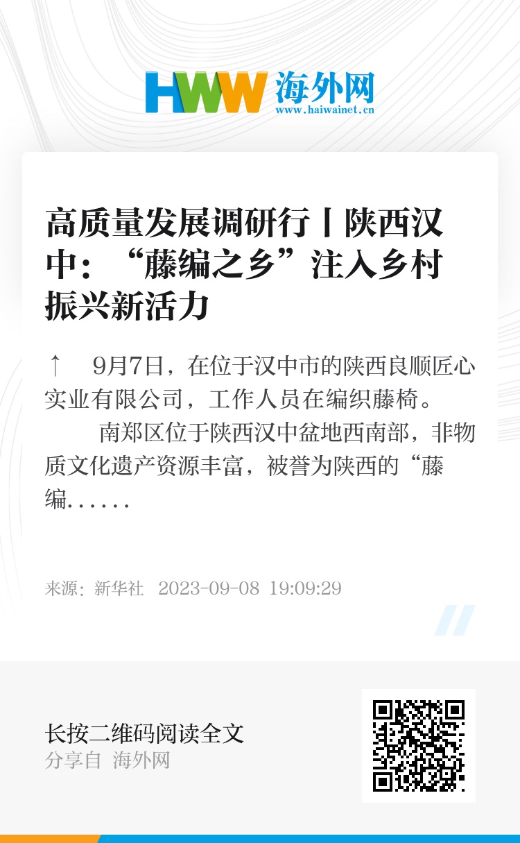 南郑区位于陕西汉中盆地西南部,非物质文化遗产资源丰富,被誉为陕西的“藤编之乡”。2021年,汉中藤编被列入国家级非物质文化遗产名录。近年来,南郑区积极探索“非遗+合作社+基地+农户”的模式,推进汉中藤编传统工艺的传承和产业振兴,带动上千户农户入社,累计培养熟练藤编工660余人,让农户在家门口实现就业增收,在传承非遗手工艺的同时,为乡村振兴注入新的活力。