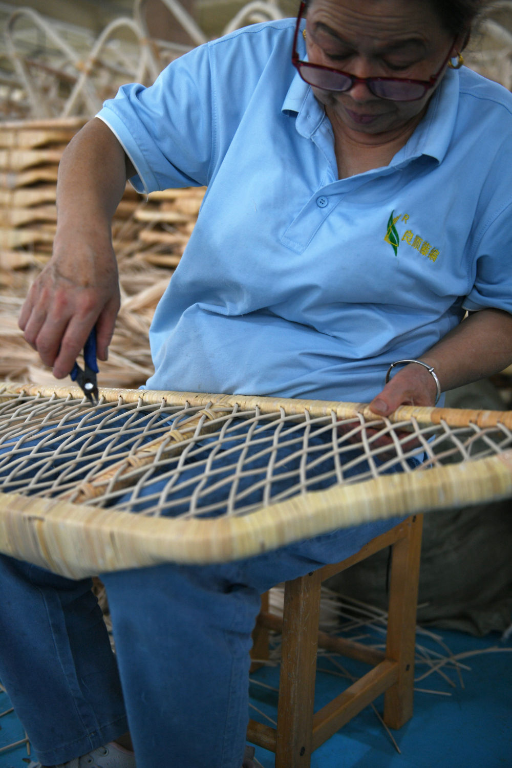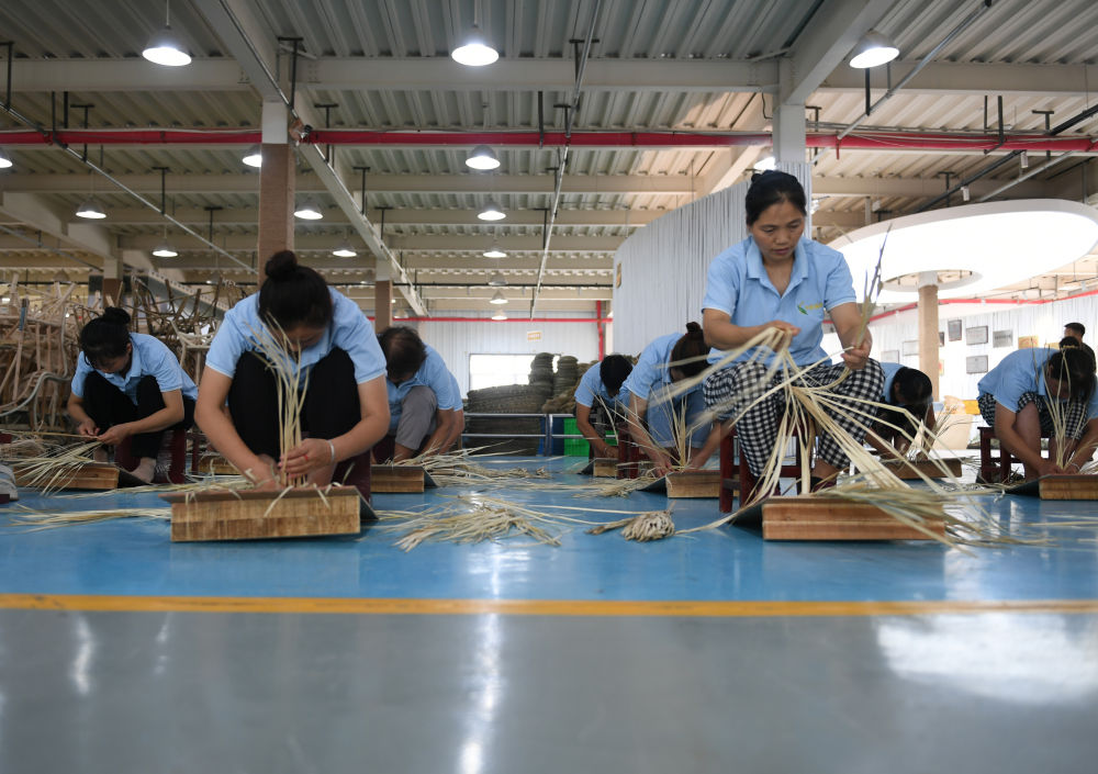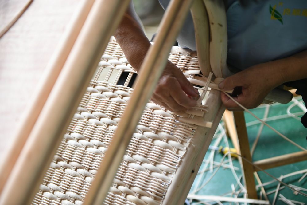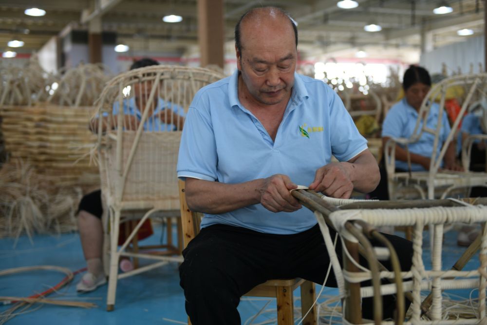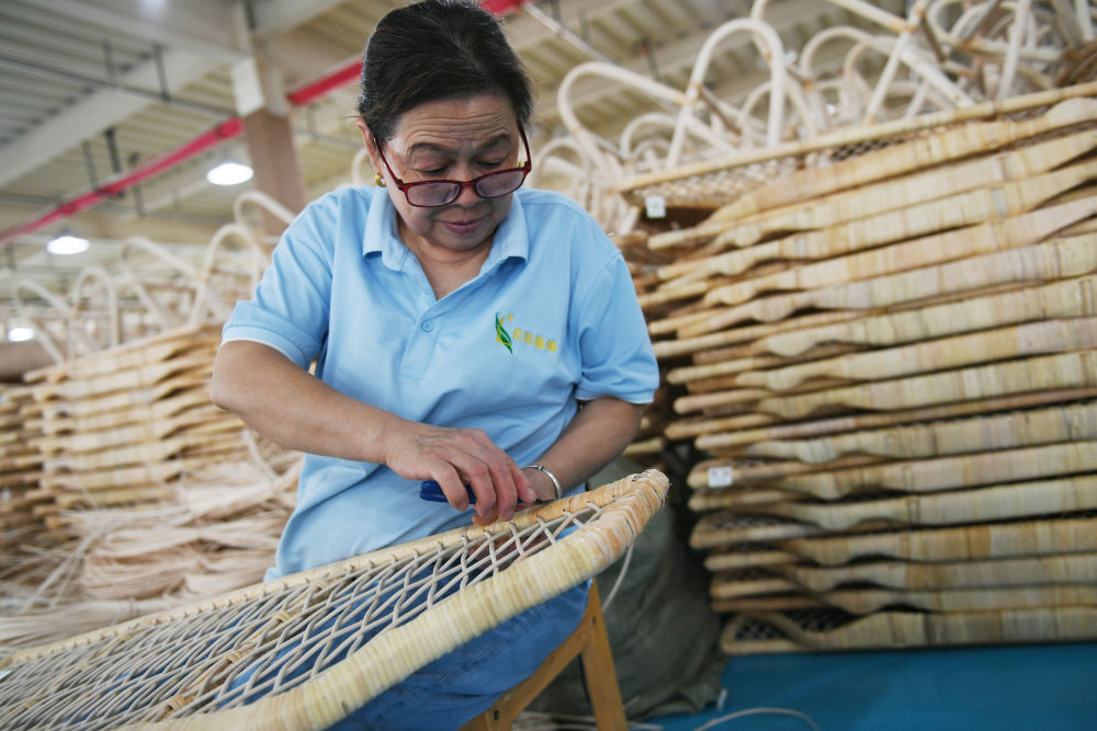 ↑ 9月7日,在位于汉中市的陕西良顺匠心实业有限公司,工作人员在编织藤椅。