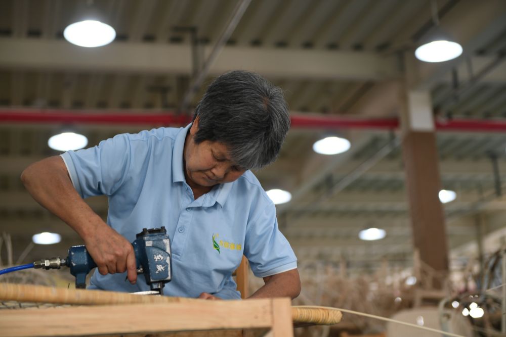↑ 9月7日,在位于汉中市的陕西良顺匠心实业有限公司,工作人员在检查藤椅部件。