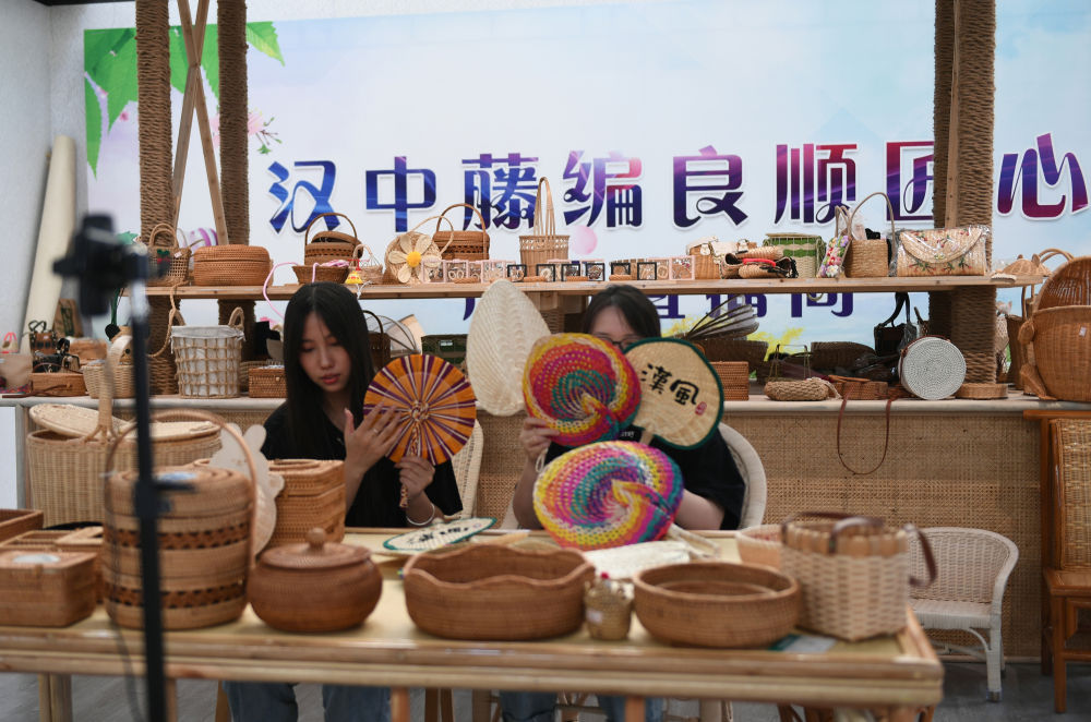 ↑ 9月7日,在位于汉中市的陕西良顺匠心实业有限公司,工作人员在直播推荐藤编工艺品。