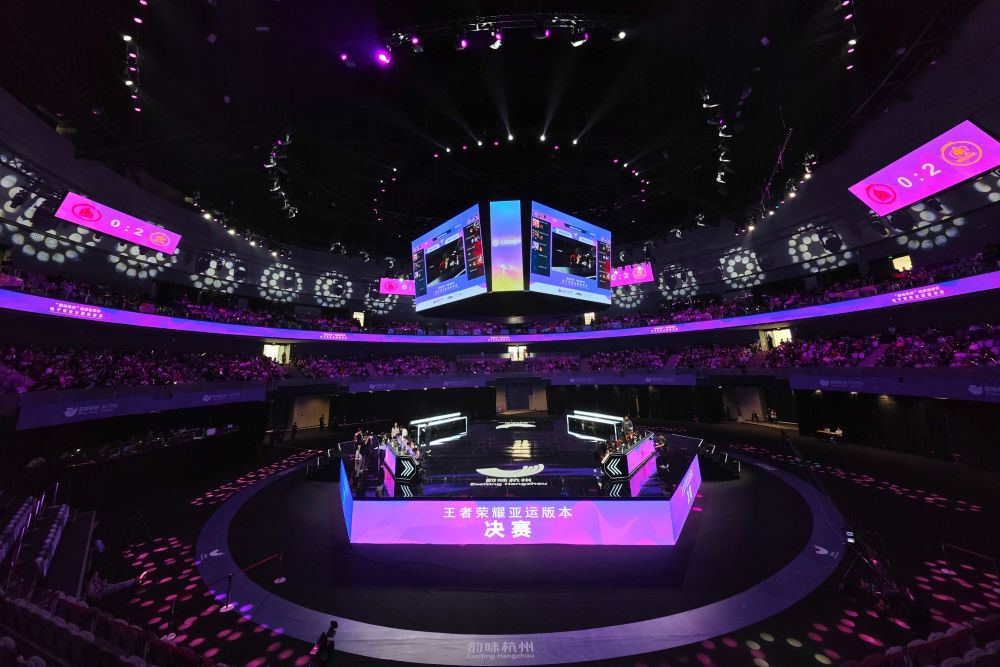 ↑在杭州电竞中心进行的“韵味杭州”电子竞技全国邀请赛王者荣耀亚运版决赛现场(2023年5月21日摄)。
