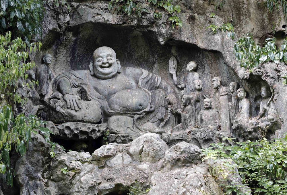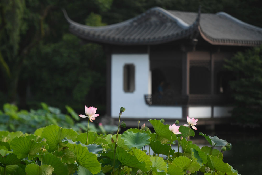 雷峰塔、灵隐寺、西泠印社掩映在湖畔草木与群山中