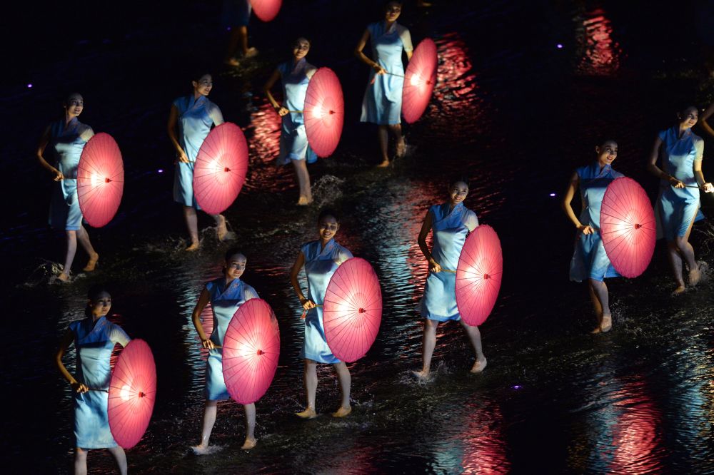 ↑演员在西湖景区进行的G20杭州峰会文艺演出《最忆是杭州》中表演《难忘茉莉花》(2016年9月4日摄)。