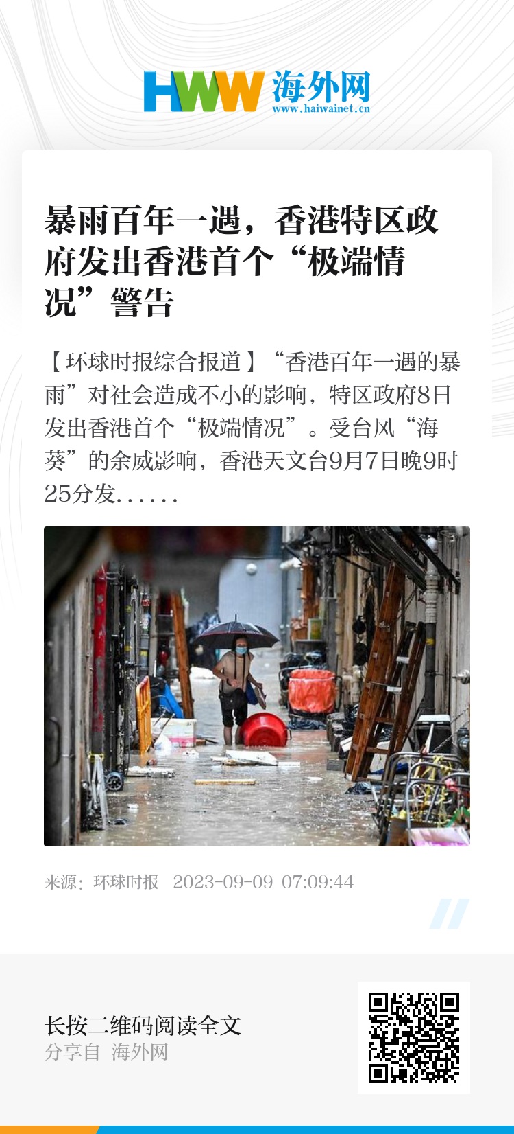 【环球时报综合报道】“香港百年一遇的暴雨”对社会造成不小的影响,特区政府8日发出香港首个“极端情况”。