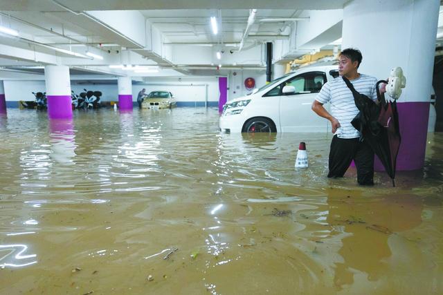9月7日晚,香港柴湾环翠停车场积水深至膝盖以上。