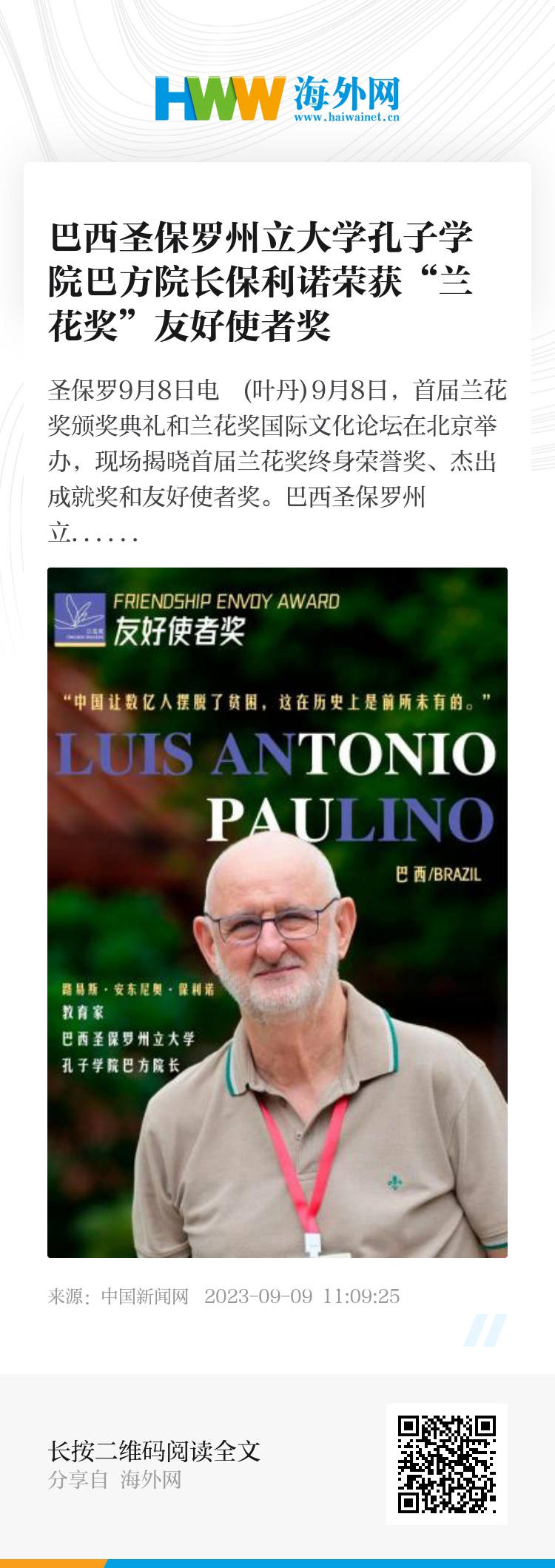 当前,保利诺教授还兼任湖北大学汉语国际教育硕士项目客座导师、湖北大学拉美研究所研究员等,积极为中巴高校学术交流、人才培养建言献策。他表示,非常感谢中国外文局举办此次兰花奖活动,作为当代巴西人中的一员,通过阅读中国文字而不断了解并喜欢上中国,也钦佩中国人民为把中国建设成一个强大的社会主义国家而进行的艰苦奋斗,期待着中国人民的成功。
