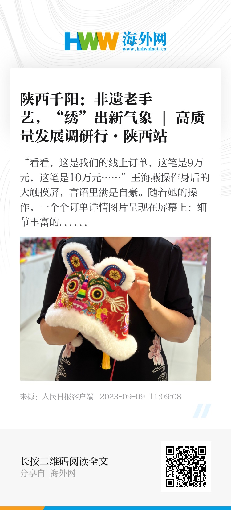 “看看,这是我们的线上订单,这笔是9万元,这笔是10万元……”王海燕操作身后的大触摸屏,言语里满是自豪。随着她的操作,一个个订单详情图片呈现在屏幕上:细节丰富的刺绣虎头帽、憨态可掬的布老虎……一件件精美的工艺品,皆出自陕西宝鸡市千阳县的“西秦刺绣”绣娘之手。