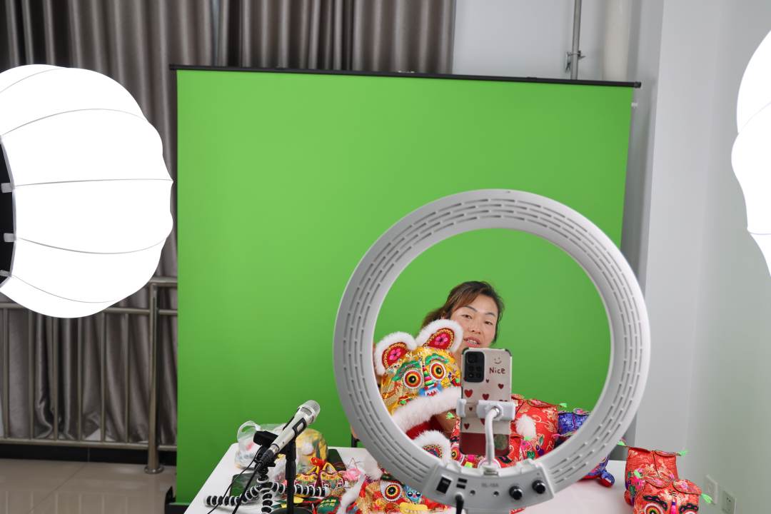 工作人员正在直播带货刺绣产品。原韬雄摄