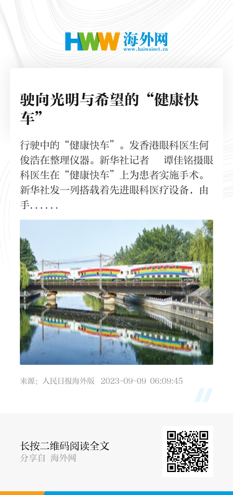这列火车,叫“健康快车”。26年来,这个建在火车上的流动眼科医院,从一列发展到四列,从车上发展到车下,从国内发展到国际,为内地28个省份和“一带一路”5个共建国家共计23万多名白内障患者送去光明与希望。