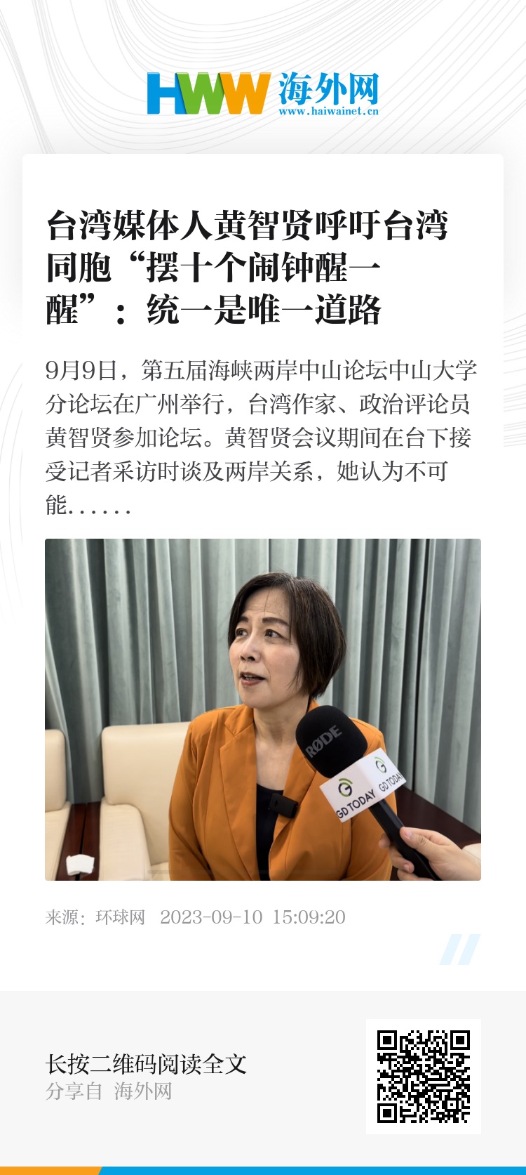 9月9日,第五届海峡两岸中山论坛中山大学分论坛在广州举行,台湾作家、政治评论员黄智贤参加论坛。黄智贤会议期间在台下接受环球网记者采访时谈及两岸关系,她认为不可能有所谓的维持现状,“台湾独立”也绝无可能。她呼吁台湾同胞“摆十个闹钟醒一醒好不好?”