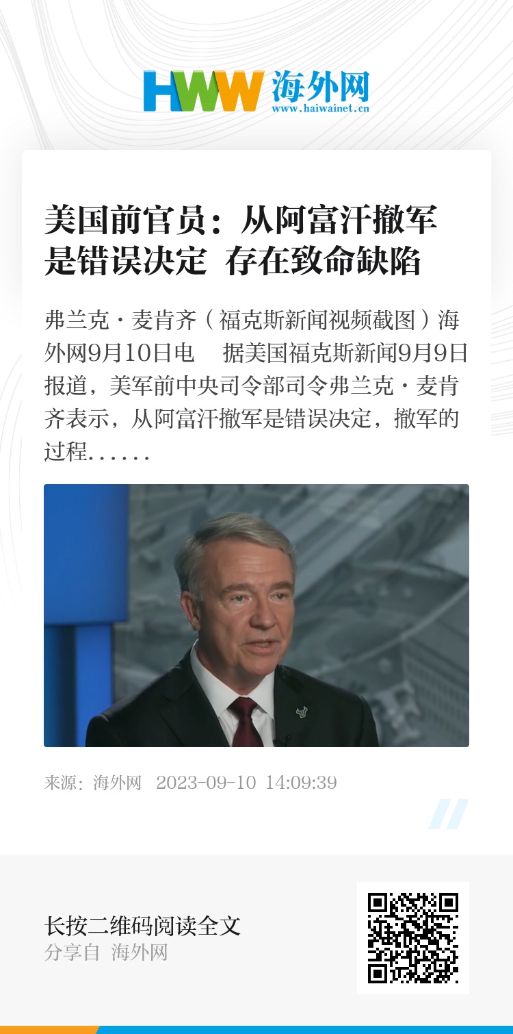 海外网9月10日电 据美国福克斯新闻9月9日报道,美军前中央司令部司令弗兰克·麦肯齐表示,从阿富汗撤军是错误决定,撤军的过程存在许多致命缺陷。